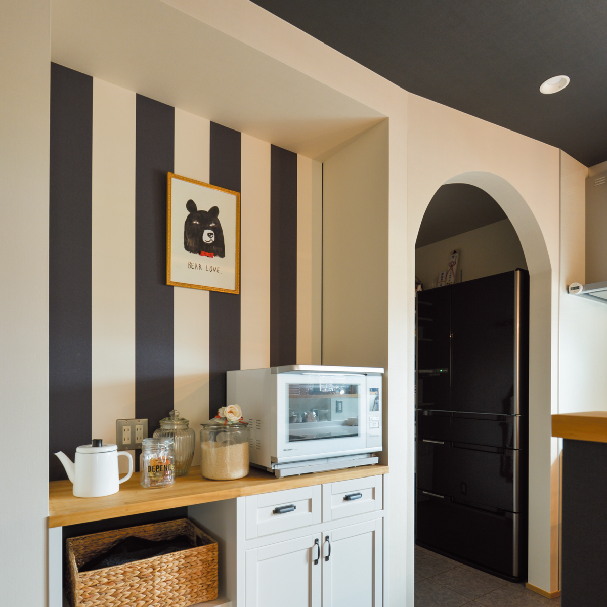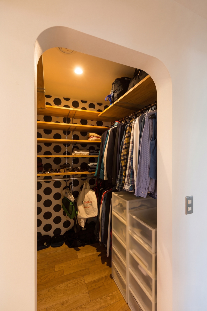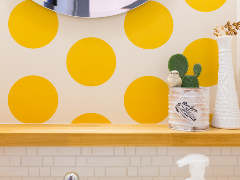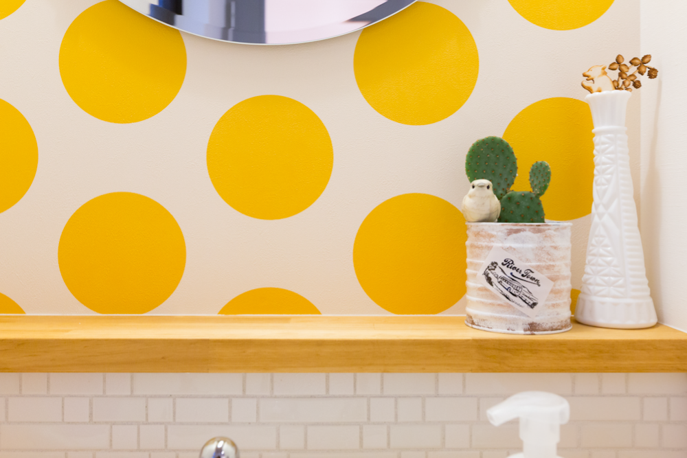 壁にはオーダーメイド壁紙Deco Cloth、ミラー部分は透明な厚みのある”ドロップインク”で立体感を作り、連続したグラフィックになるように装飾いたしました。